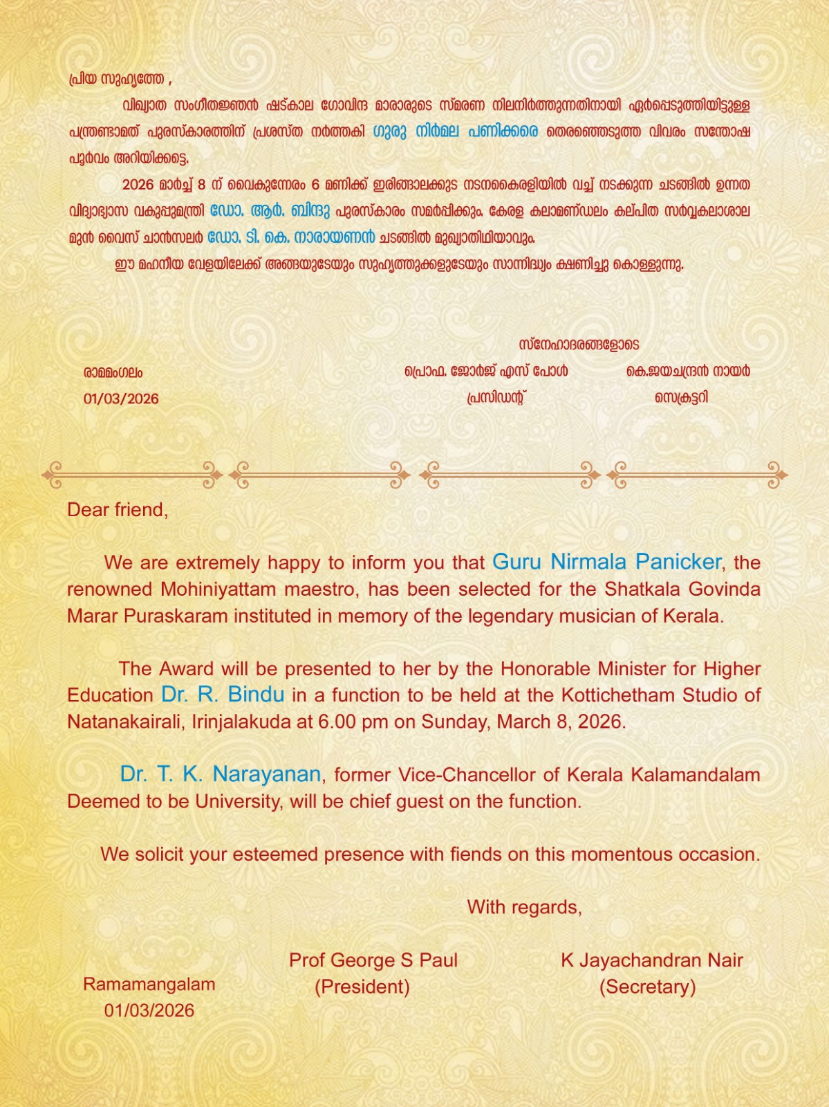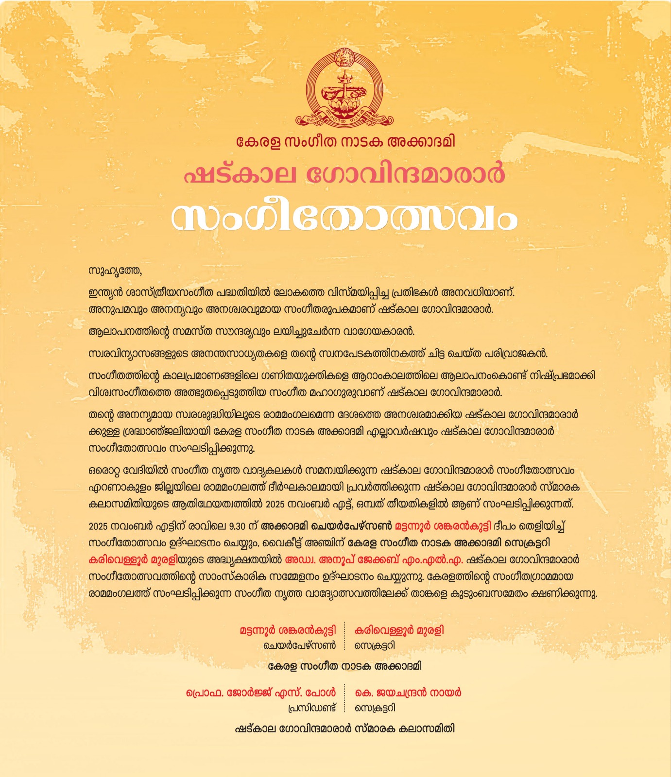 (Secretary, Kerala Sangeetha Nataka Academy)