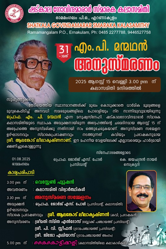 Dignitories: Prof. V. P. G. Marar, Prof. George S. Paul (President, Shatkala Govinda Marar Smaraka Kala Samithy), M. J. Jacob (M. L. A, Piravom Constituency), C. R. Neelakandhan (Environmental Activist), Bindu Saji (President, Grama Panchayath, Ramamangalam), E. S. Sajeevan (Vice President, Grama Panchayath, Ramamangalam), Georgekutty Paul (Block Panchayath Standing Committee Chairman), K. Jayachandran (Secretary, Shatkala Govinda Marar Smaraka Kala Samithy)