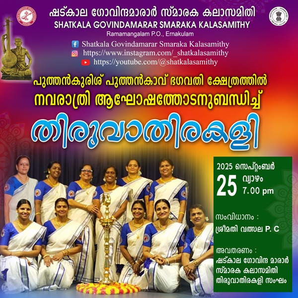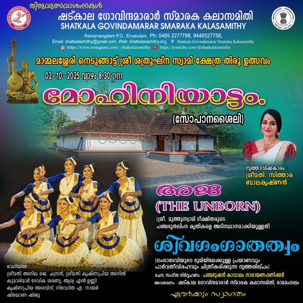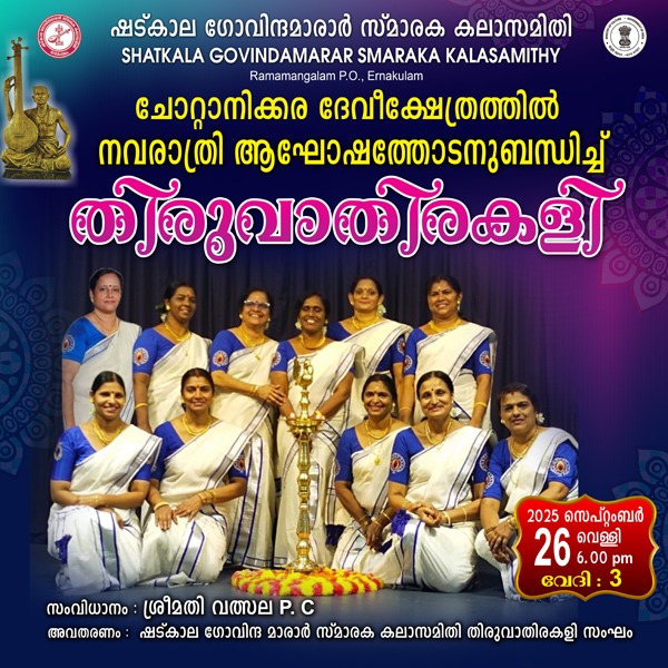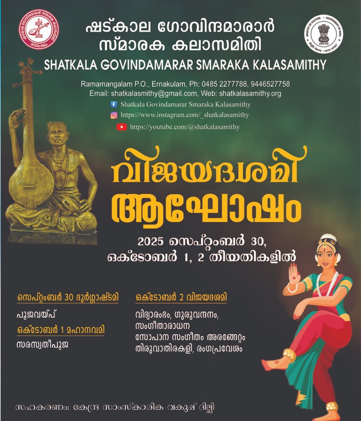 Venue: Shatkala Govinda Marar Smaraka Kala Samithy Auditorium, Ramamangalam 6. 00 P. M POOJAVAIPPU October 20 Mahanavami Venue: Shatkala Govinda Marar Smaraka Kala Samithy Auditorium, Ramamangalam 6. 30 P. M SARASWATHY POOJA